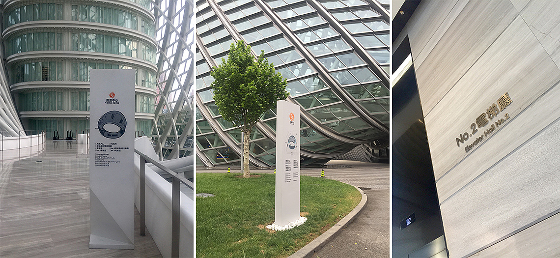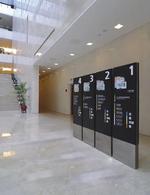 辦公區(qū)域中的落地式分流標(biāo)識(shí)牌主要放置于在大堂、廣場(chǎng)或樓梯出口及岔路口等人員比較密集的場(chǎng)所,起著指示與導(dǎo)向的作用。在強(qiáng)調(diào)以人為本的社會(huì),建筑作為流動(dòng)的音樂(lè),人文精神更是在其中得到體現(xiàn)。大型的落地式分流標(biāo)識(shí)牌作為現(xiàn)代建筑的組成部分,其造型的設(shè)計(jì)、色彩的搭配及制作的工藝等均需仔細(xì)的斟酌,以使之與主體建筑及綠植相互輝映。